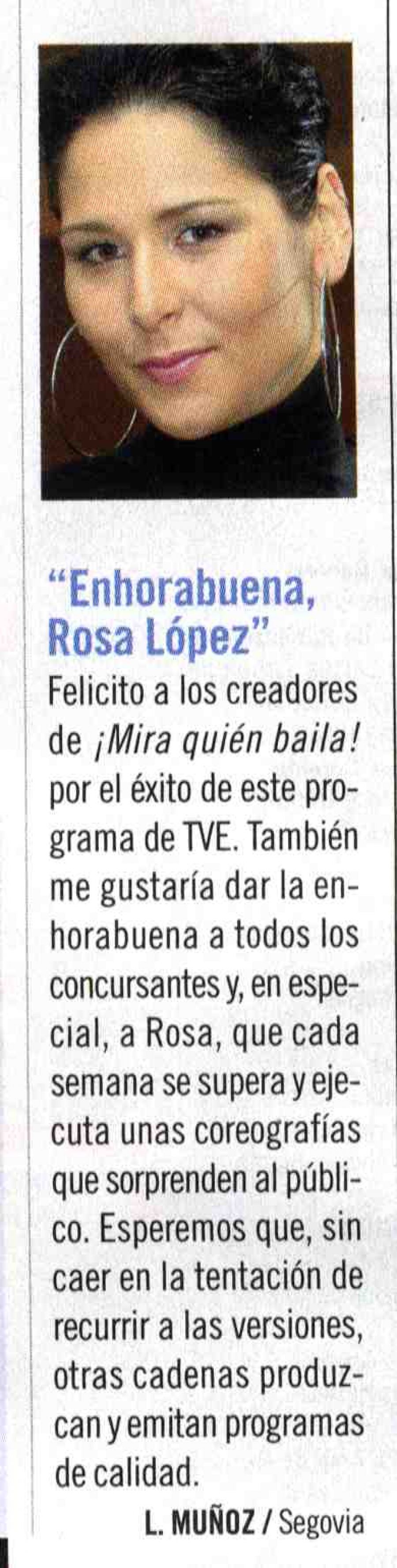 "Enhorabuena, Rosa López"El Semanal TV14/04/2006Escaneada por Rosamania